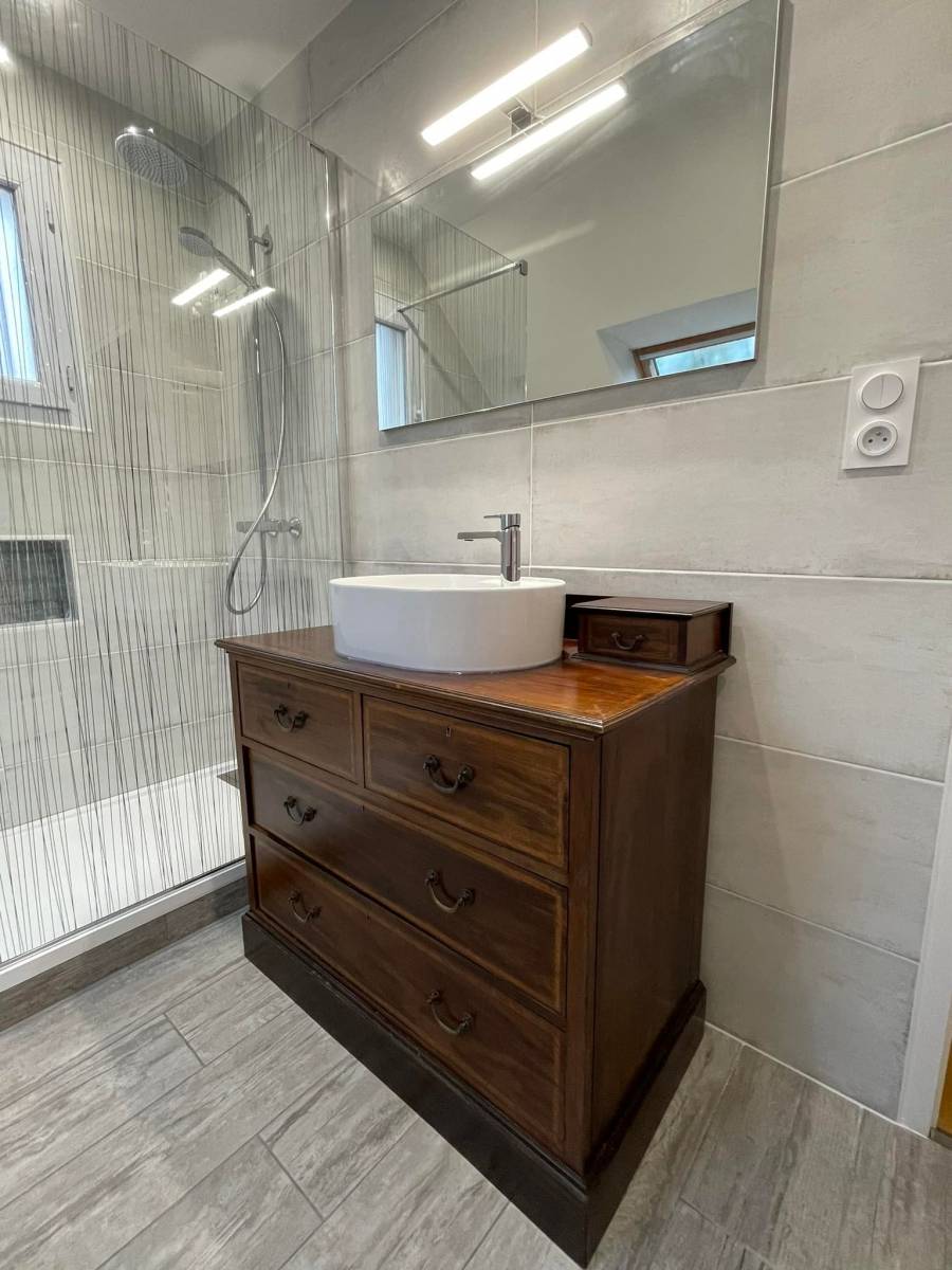 Pour le petit plus, une ancienne commode fait office de meuble de lavabo accompagnée d'une très belle vasque et d'un grand miroir !
