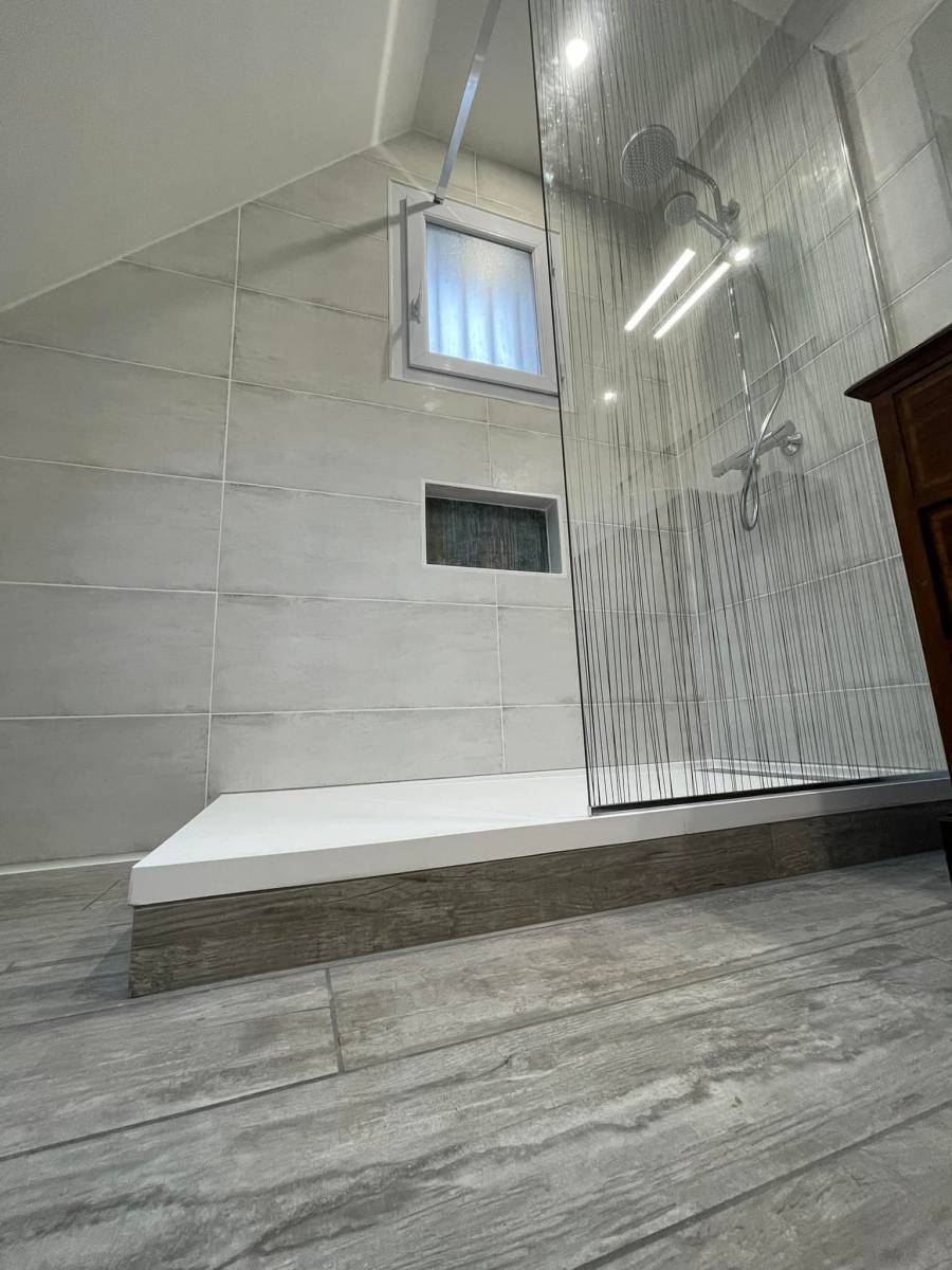 Carrelage imitation parquet, avec un retour subtile sur le receveur.